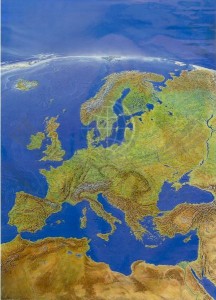 Arkusz ściennej mapy panoramicznej prezentującej rzut satelitarny Europy.