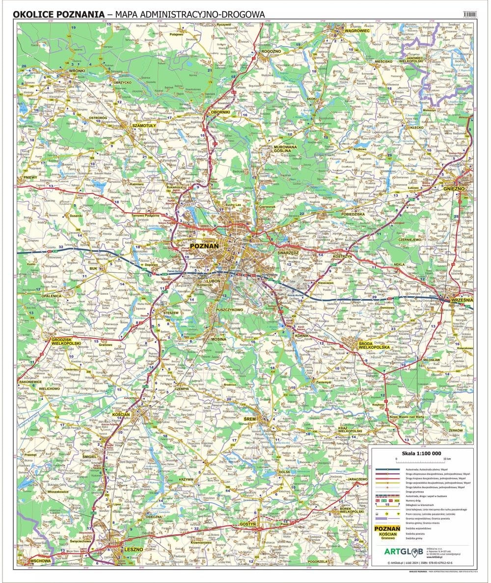 Arkusz administracyjno-drogowej mapy ściennej okolic Poznania w skali 1:100 000 wydawnictwa ArtGlob.