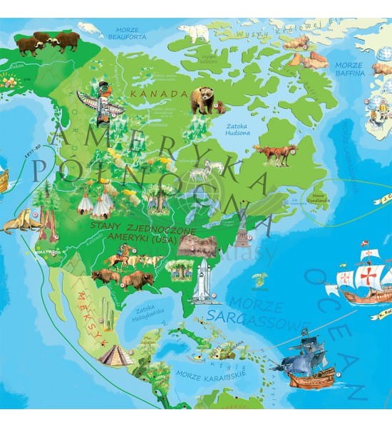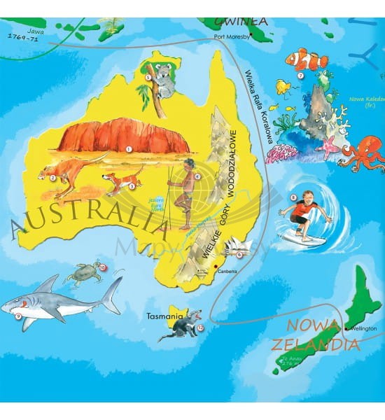 Arkusz mapy ściennej świata dla dzieci, pełniącej rolę edukacyjną oraz dekoracyjną. Zaznaczono na niej barwnie kontynenty wraz z ukształtowaniem terenu, jak też za pomocą kolorowych piktogramów najbardziej znane budowle świata, zwierzęta, pomniki przyrody, wydarzenia. Dzięki temu mapa jest fascynującym źródłem wiedzy o historii i teraźniejszości naszej planety. Przekazuje w ciekawy sposób informacje z zakresu geografii, przyrody i kultury. Pobudza wyobraźnię, zachęca do zdobywania wiedzy i inspiruje.