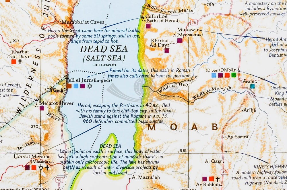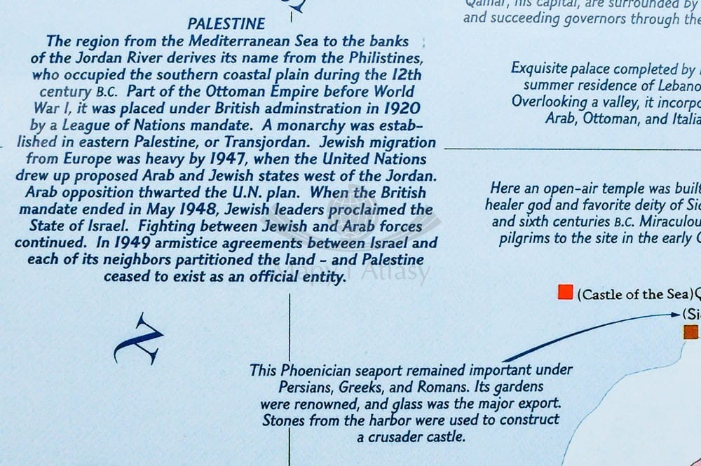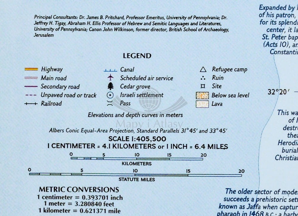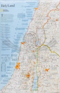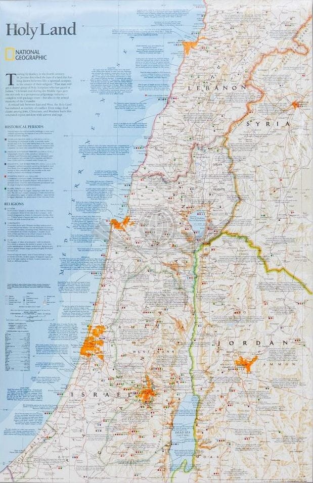 Arkusz ściennej mapy Ziemi Świętej w skali 1:405 500 wydawnictwa National Geographic obejmującej: Liban, Syrię, Izrael i Jordanię. Na mapie umieszczono podstawowe informacje o religiach, okresach historycznych oraz ważnych miejscach.