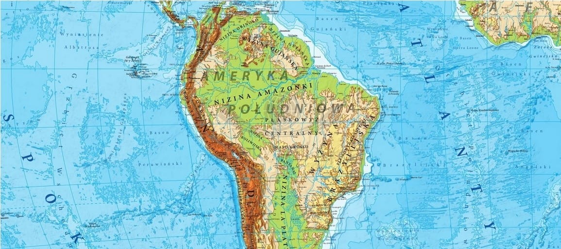 Mapa fizyczna świata z ukształtowaniem powierzchni lądów i dna oceanów.