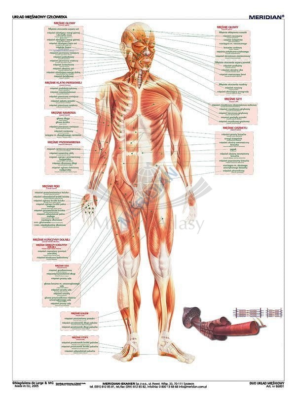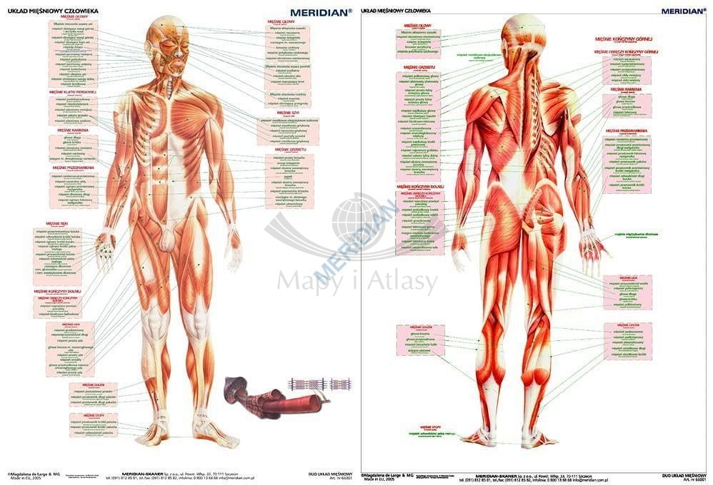 Dwustronna ścienna plansza edukacyjna do biologii przedstawiająca układ mięśniowy człowieka. Dzięki przejrzystym, łatwo zapadającym w pamięć kolorowym ilustracjom jest doskonałym, szybko przyswajalnym źródłem wiedzy...