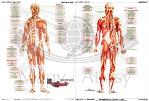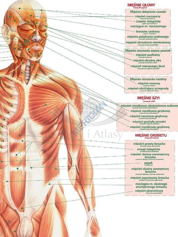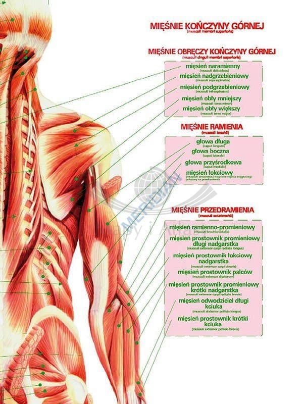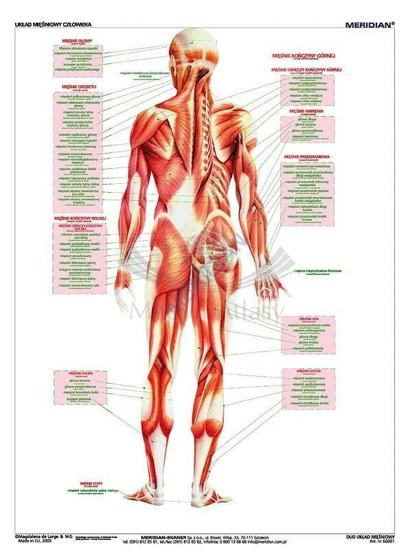 Dwustronna ścienna plansza edukacyjna do biologii przedstawiająca układ mięśniowy człowieka.