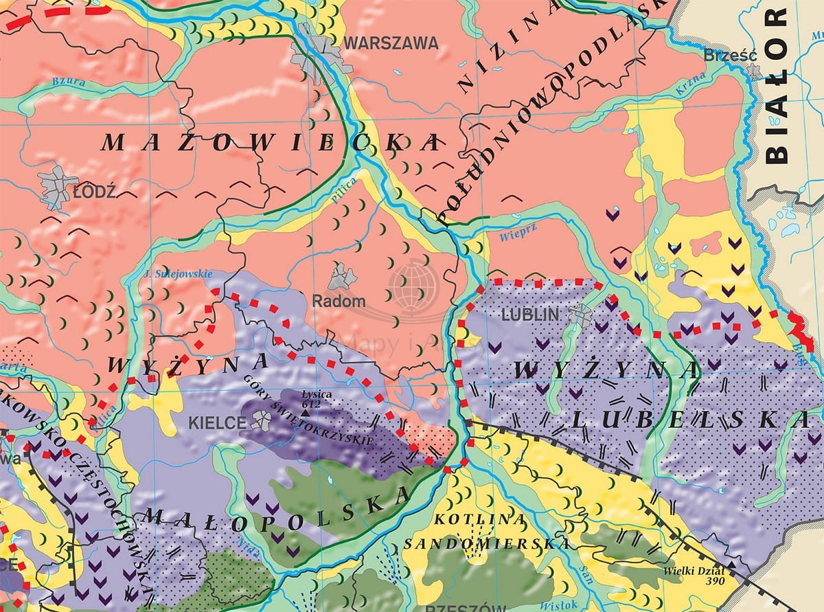 Mapa w postaci fototapety, przedstawiająca geomorfologię Polski, typy rzeźby i ich pochodzenie.