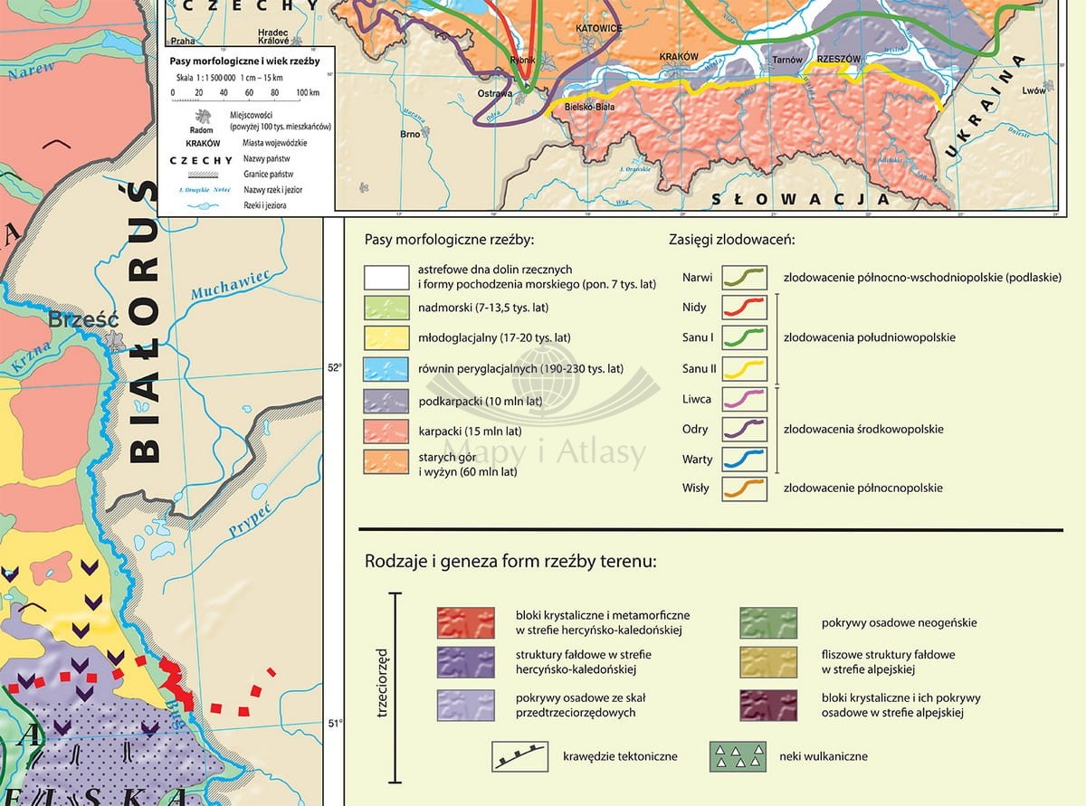 Mapa w postaci fototapety, przedstawiająca geomorfologię Polski, typy rzeźby i ich pochodzenie. Na mapie uwzględnione są najważniejsze rodzaje procesów rzeźbotwórczych z podziałem na epoki geologiczne, w których kształtowały one powierzchnię naszego kraju. Dodatkowo pokazane są przebiegi krawędzi tektonicznych i zasięgi zlodowaceń: Wisły, Odry i Sanu II. Umiejscowienie na mapie obecnych krain geograficznych pozwala na łatwiejsze zrozumienie historii geologicznej Polski.
