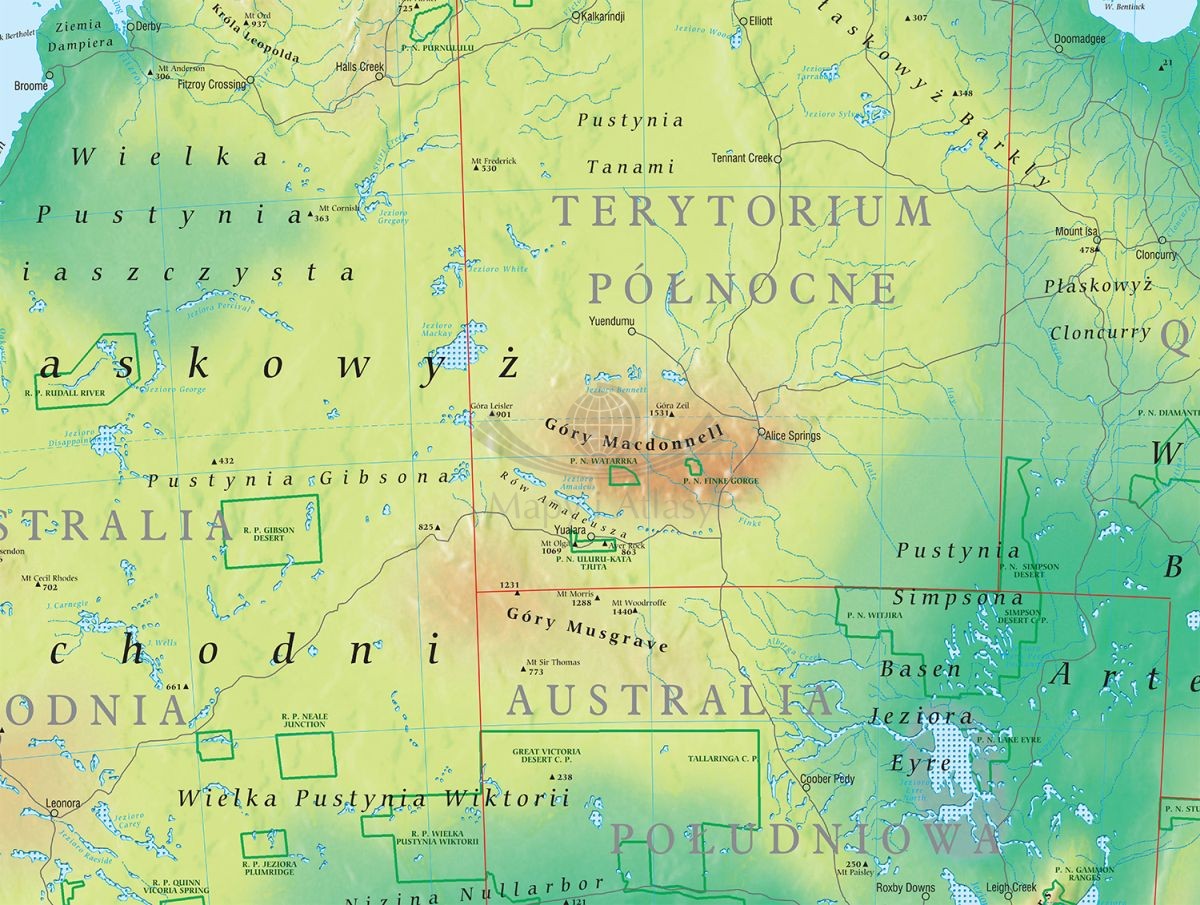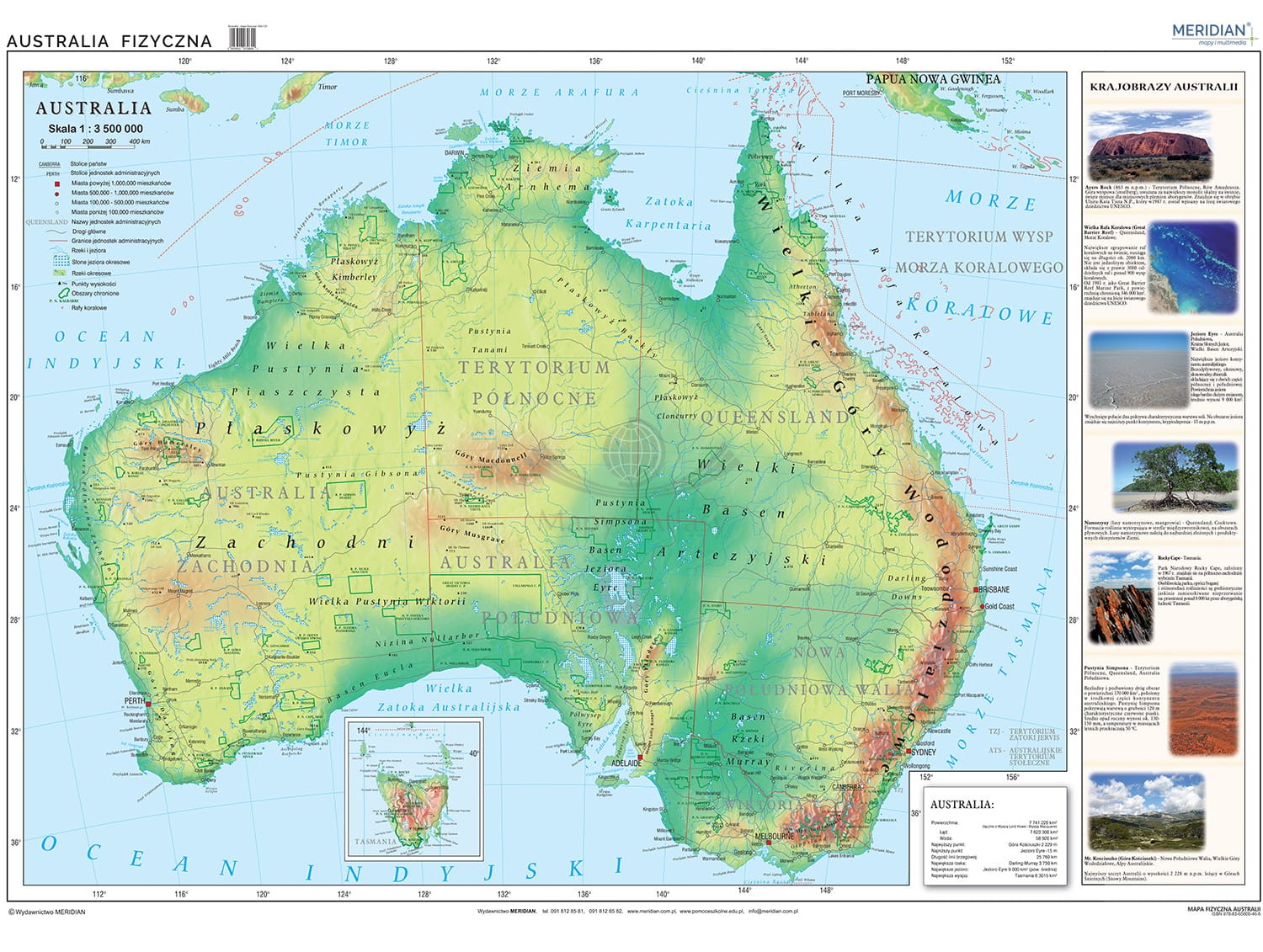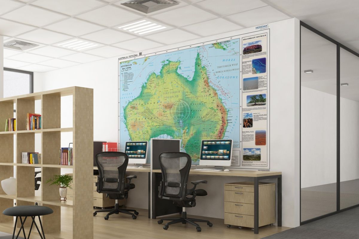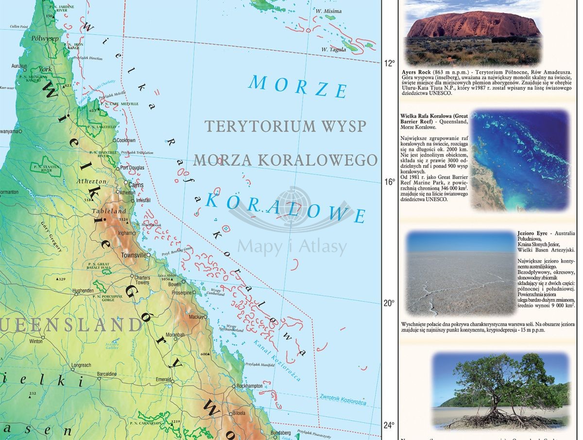 Fizyczna mapa szkolna do geografii, w postaci fototapety, przedstawiająca ukształtowanie powierzchni i krainy geograficzne Australii. Klasyczna mapa fizyczna została wzbogacona dodatkowo o informacje na temat ochrony środowiska oraz lokalizacje i opisy spektakularnych, australijskich "cudów natury" - obiektów wpisanych na Listę Światowego Dziedzictwa UNESCO.