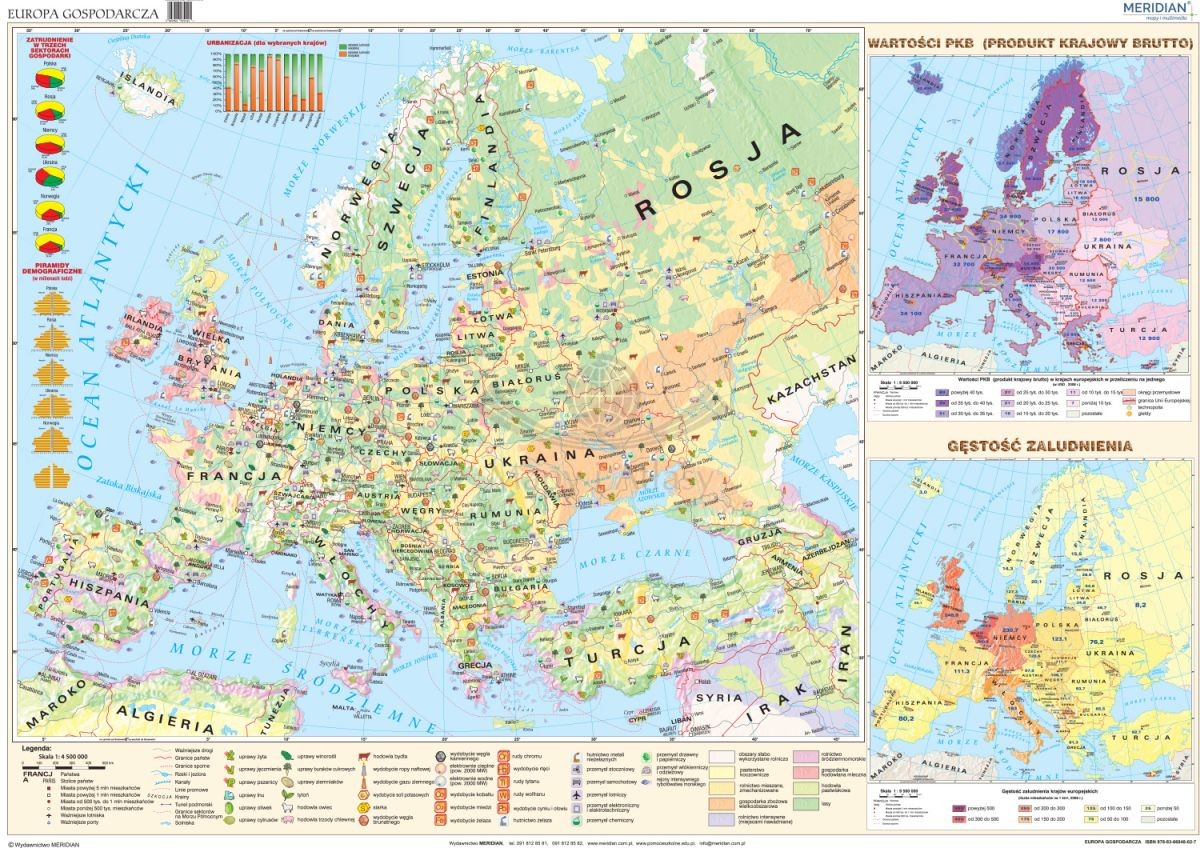 W kartonach bocznych pokazano wartości PKB (produktu krajowego brutto) oraz gęstość zaludnienia dla krajów europejskich. Z boku mapy umieszczone są diagramy, przedstawiające zróżnicowanie zatrudnienia w trzech sektorach gospodarki, piramidy demograficzne oraz urbanizację na przykładach kilku państw .
