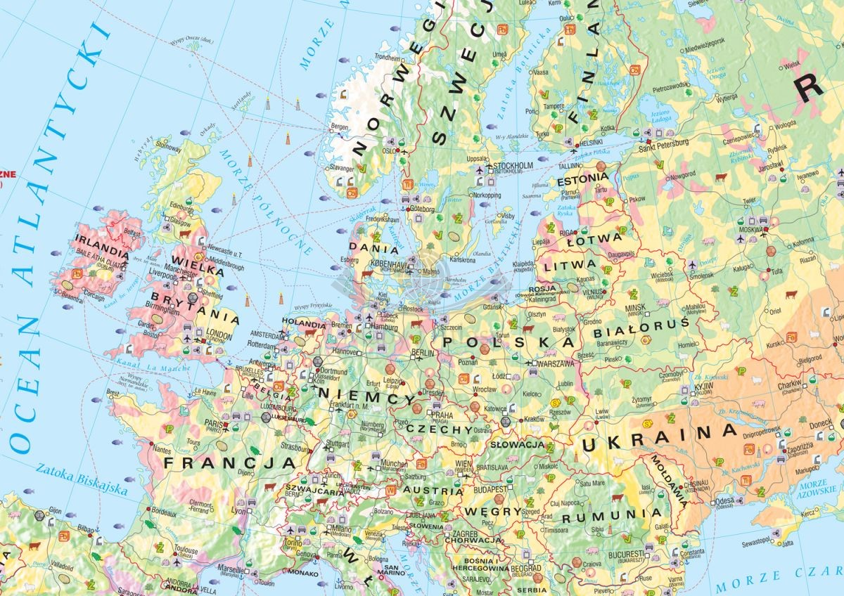 Mapa szkolna w postaci fototapety, przedstawiająca zagadnienia gospodarcze i demograficzno-społeczne w Europie.
