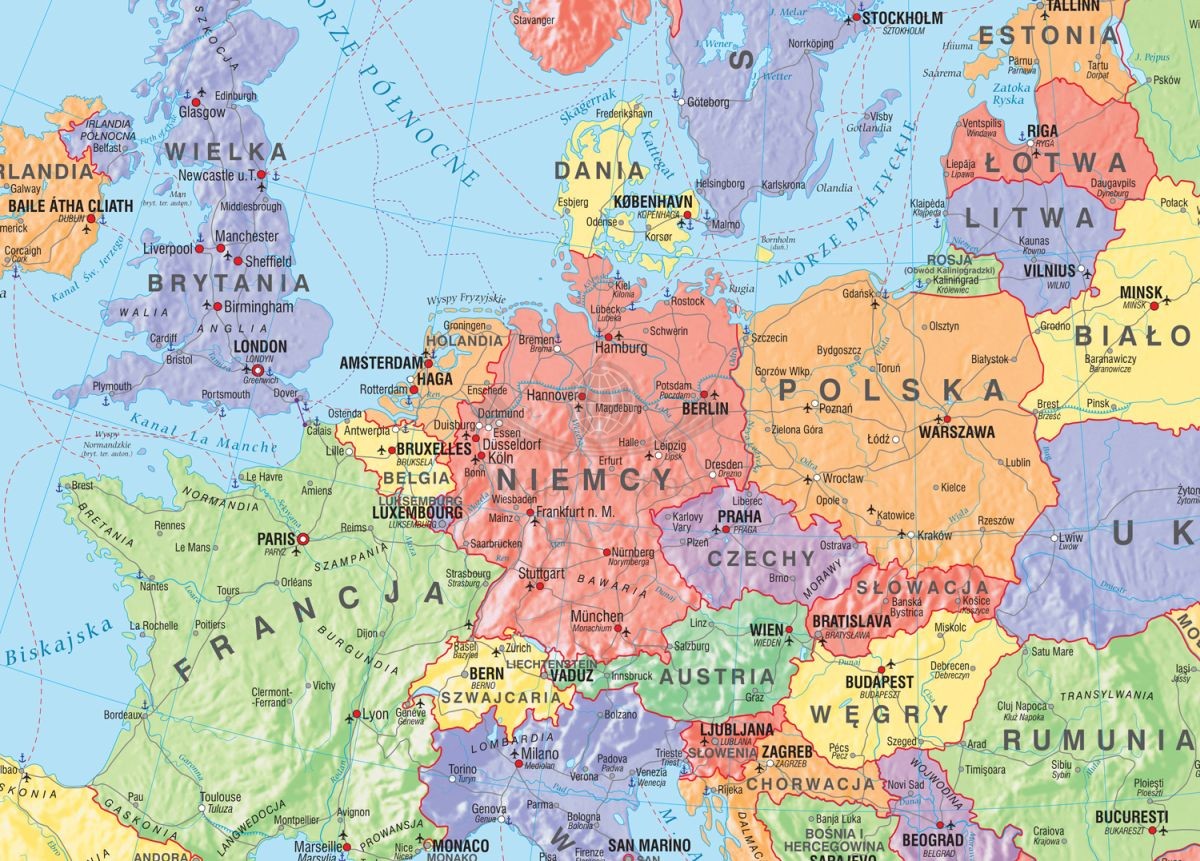 Mapa szkolna w postaci fototapety, przedstawiająca podział polityczny Europy. Układ państw i ich granice oraz główne miasta i regiony pokazane są na tle reliefu powierzchni ziemi. Na mapie pokazano sieć głównych dróg, ważne linie promowe, największe lotniska i porty morskie. Zaznaczono także granice sektorów ekonomicznych na Morzu Północnym.