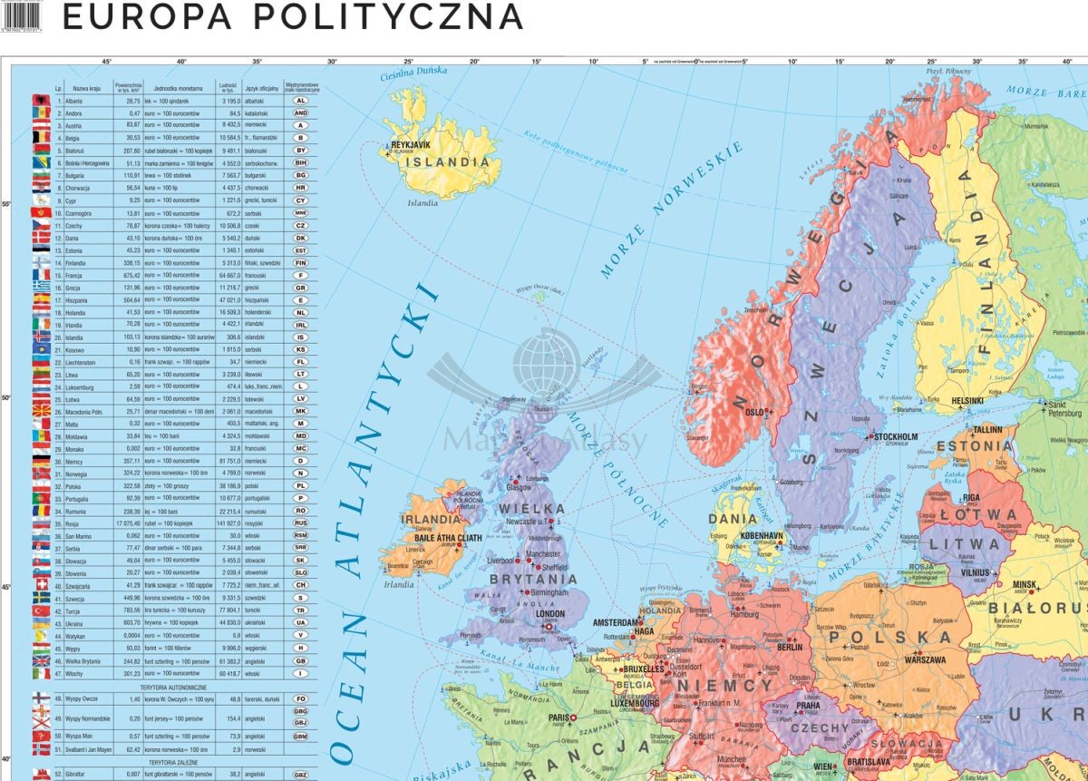 Z boku mapy umieszczone jest tabelaryczne zestawienie najważniejszych danych o wszystkich państwach europejskich. Znajdziemy tam takie informacje jak: powierzchnia, ludność, waluta, język oficjalny oraz flaga.