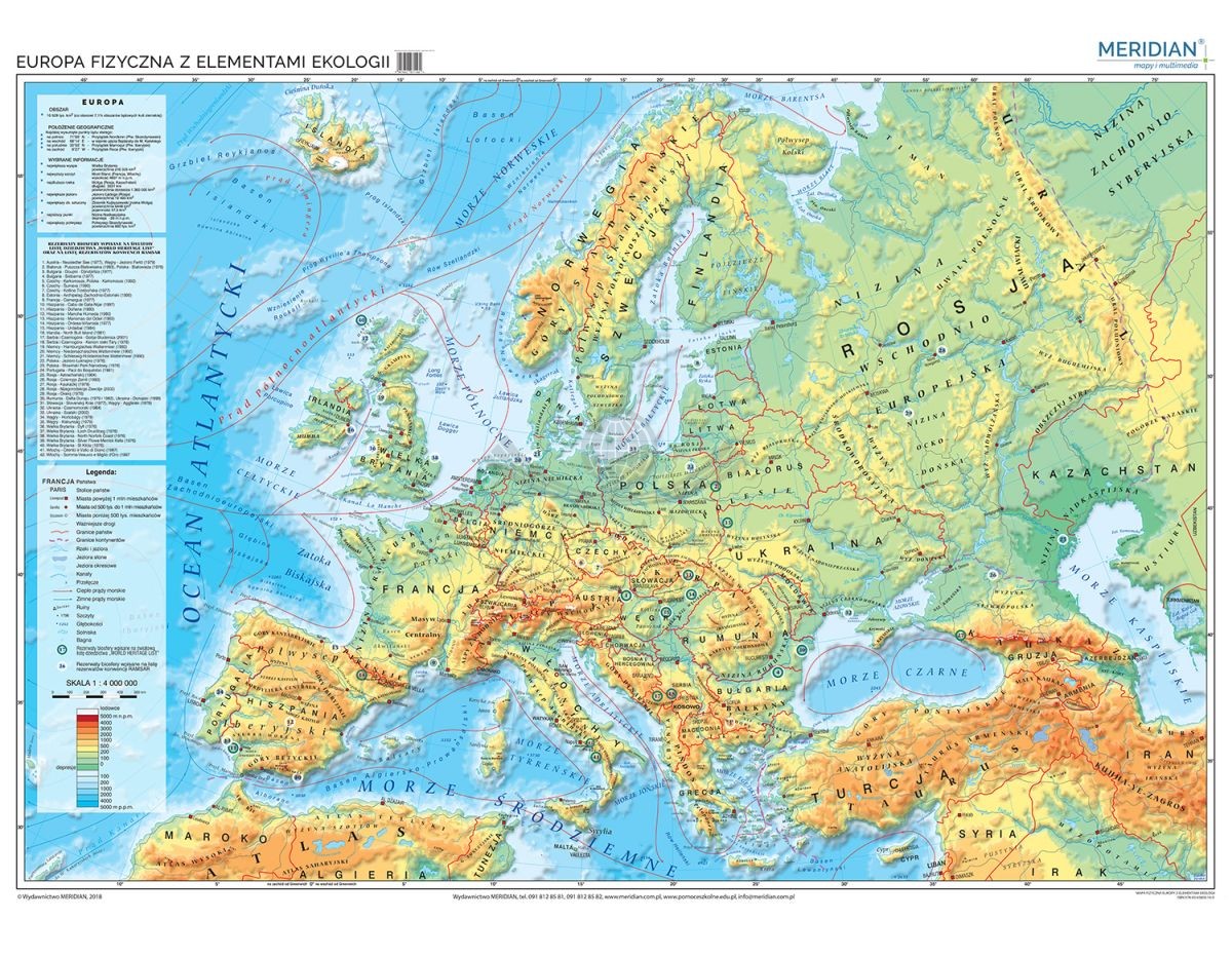 Mapa szkolna do geografii w postaci fototapety przedstawiająca ukształtowanie powierzchni i krainy geograficzne Europy. Klasyczna mapa fizyczna Europy została wzbogacona dodatkowo o informacje na temat ochrony środowiska. Pokazane jest na niej rozmieszczenie rezerwatów biosfery wpisanych na światową listę UNESCO. Lista rezerwatów dodatkowo wypisana jest w panelu bocznym.