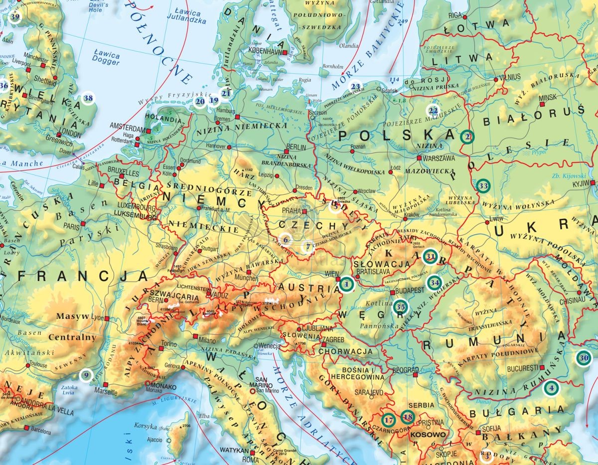 Mapa szkolna do geografii w postaci fototapety przedstawiająca ukształtowanie powierzchni i krainy geograficzne Europy.