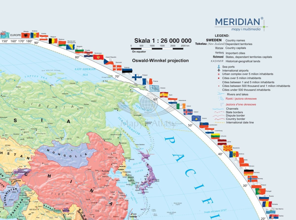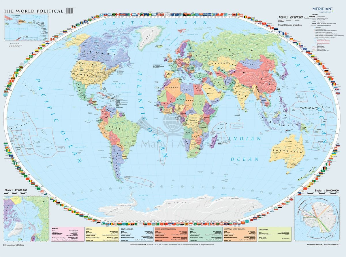 Mapa wzbogacona jest flagami państw oraz informacjami fizycznogeograficznymi dla każdego kontynentu. W kartonach bocznych umieszczone są następujące mapy: