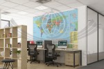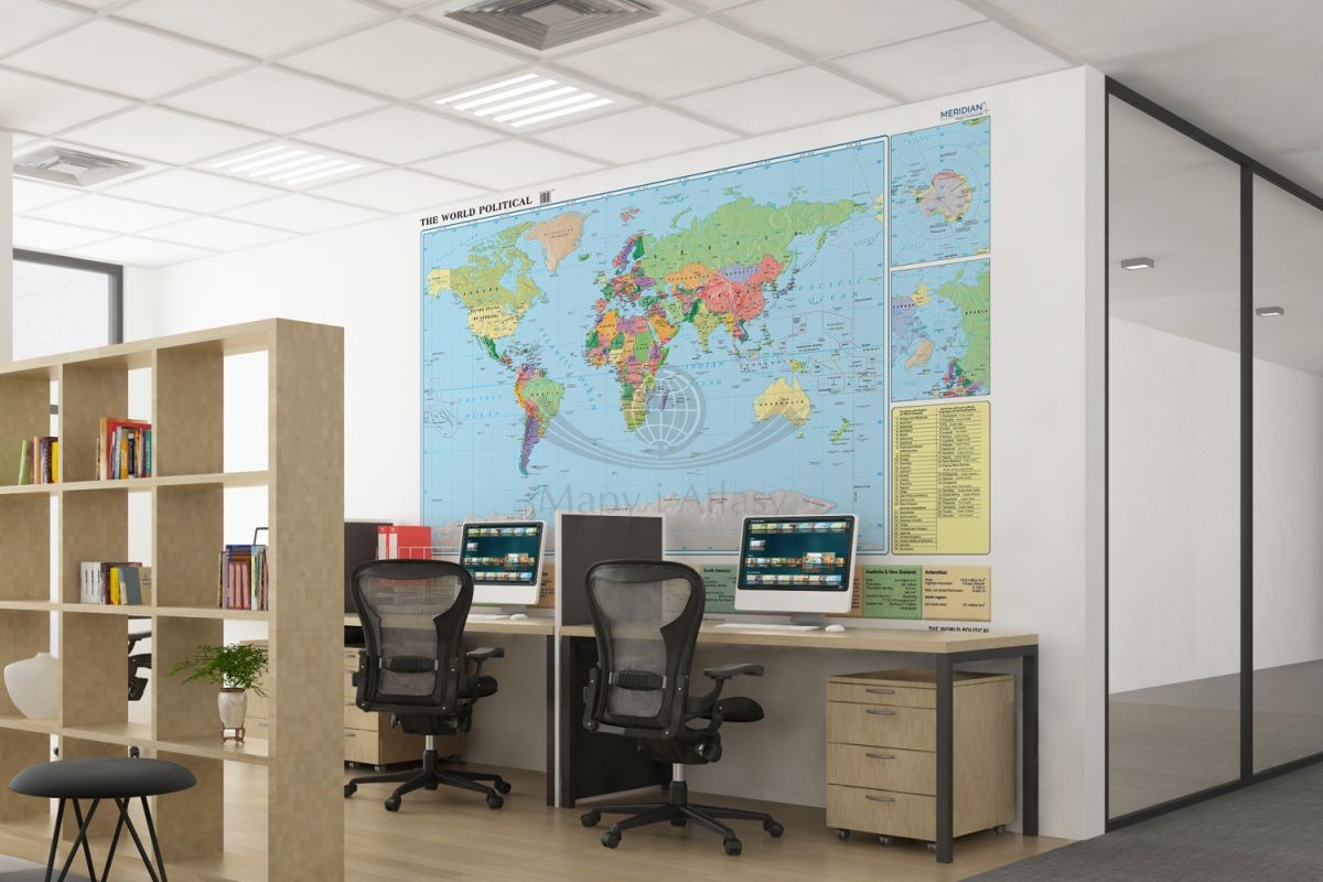 Mapa szkolna w formie fototapety, przedstawiająca podział polityczny świata oraz użytkowanie języka angielskiego na świecie.