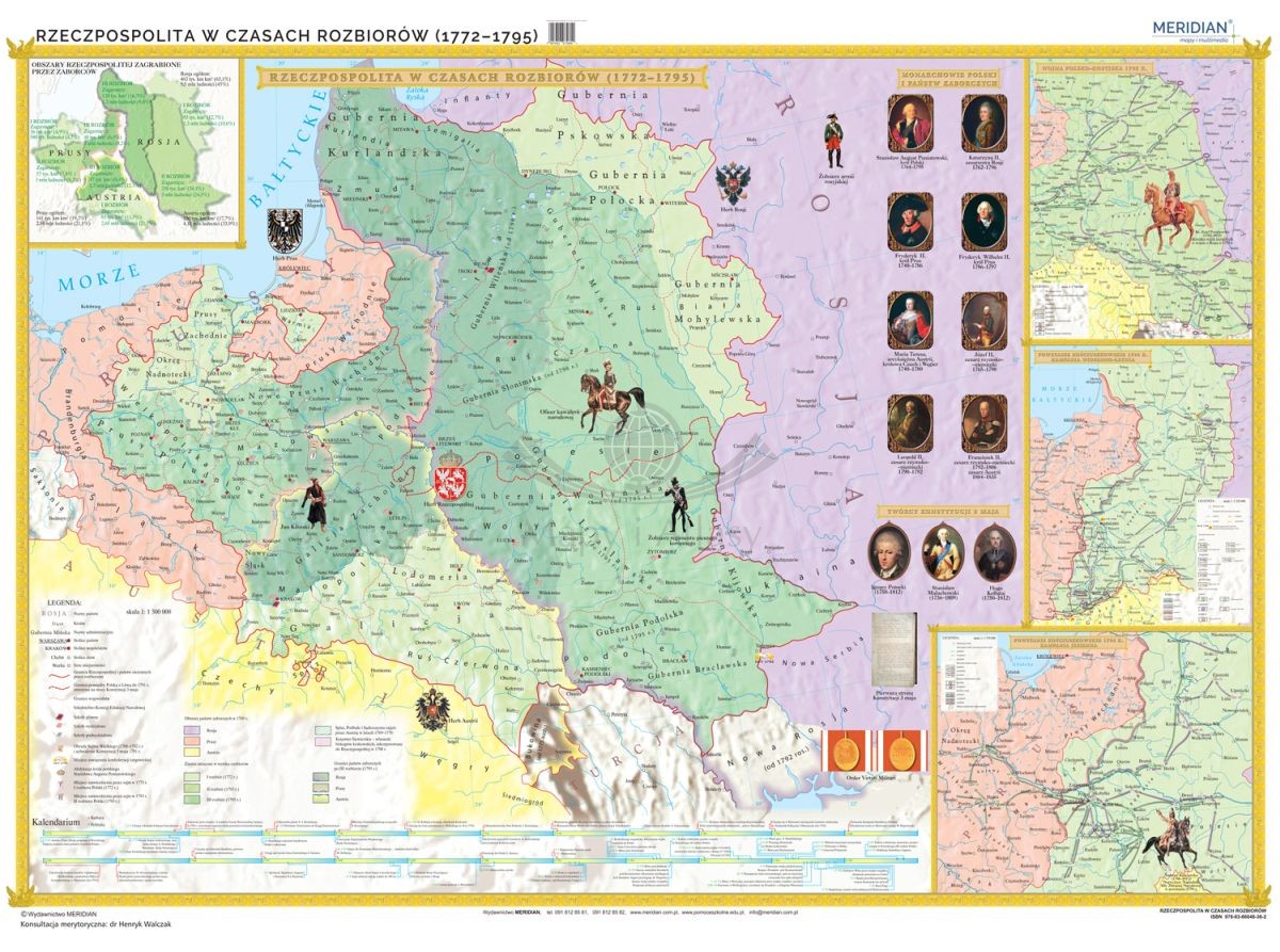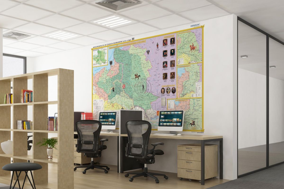 Fototapeta przedstawiająca mapę Rzeczpospolitej w okresie rozbiorów z podziałem na województwa. Mapę dodatkowo wzbogaca interesująca grafika, liczne ilustracje, portrety monarchów Polski i państw zaborczych, twórców Konstytucji 3-go maja wraz z reprintem jej pierwszej strony. Ponad to zaznaczone są miejsca zatwierdzenia przez sejm I i II rozbioru Polski, a także szkolnictwo Komisji Edukacji Narodowej: szkoły główne, wydziałowe i podwydziałowe.