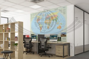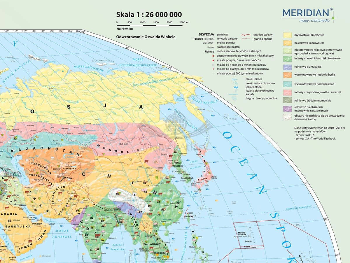 Gospodarcza mapa tematyczna, w formie fototapety samoprzylepnej, przedstawiająca strukturę użytkowania ziemi na świecie. Na tym tle sygnaturami ukazane jest rozmieszczenie upraw istotnych ekonomicznie roślin, hodowli zwierząt gospodarczych oraz rybołówstwa. Główni producenci opisani są wartościami procentowego udziału w produkcji światowej.