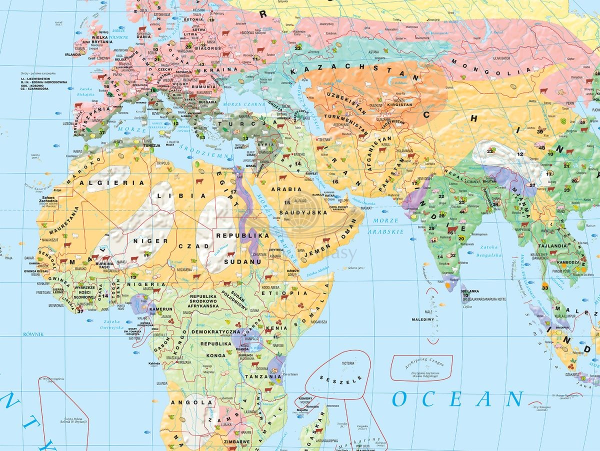 Gospodarcza mapa tematyczna, w formie fototapety samoprzylepnej, przedstawiająca strukturę użytkowania ziemi na świecie.