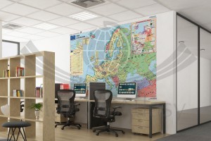 Mapa szkolna w postaci fototapety, przedstawiająca aktualny stan Unii Europejskiej i strefę Schengen.