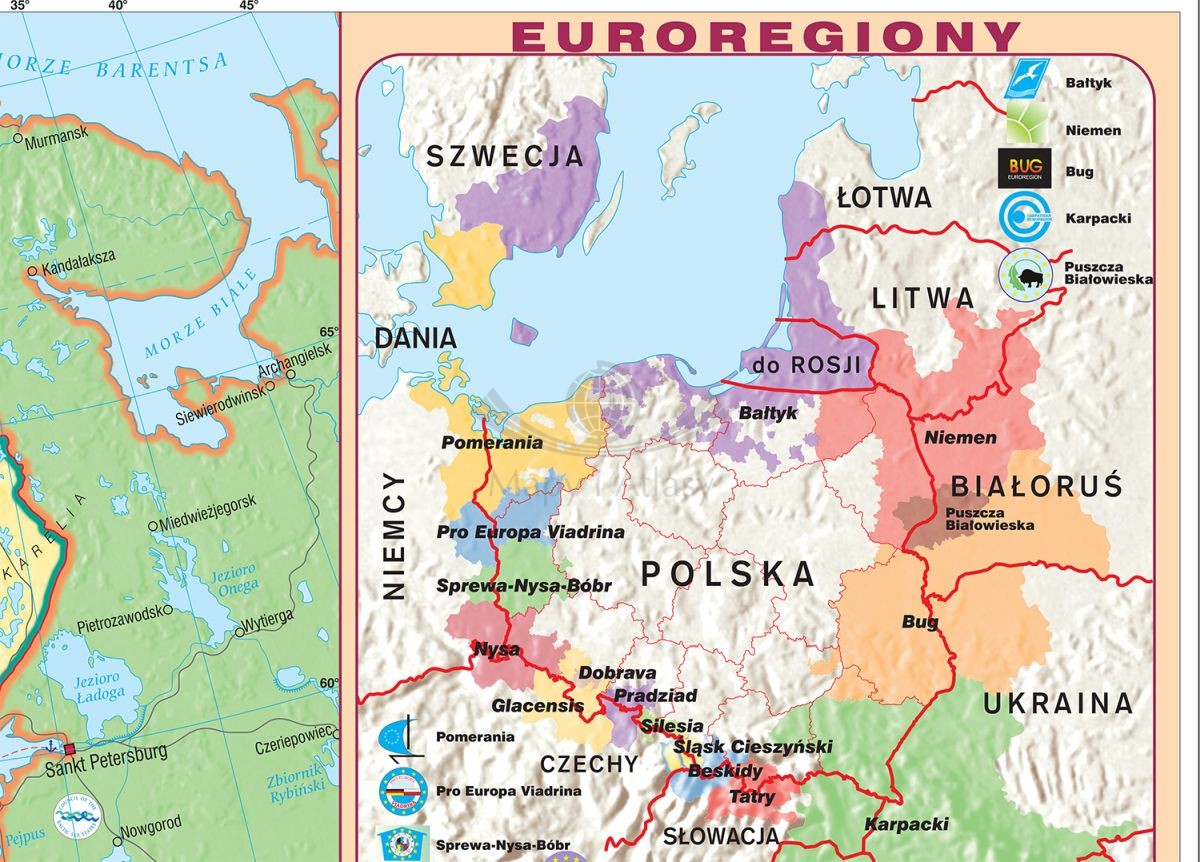Osobne mapki prezentują udział Polski w układach Euroregionalnych z państwami ościennymi oraz pozaeuropejskie obszary wchodzące w skład UE oraz obszary położone wewnątrz Unii a pozostające poza jej strukturą.