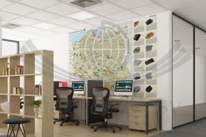 Plansza edukacyjna w postaci fototapety, przedstawiająca rozmieszczenie głównych złóż surowców energetycznych, metalicznych, chemicznych oraz skalnych. Na tym tle ukazane są lokalizacje i zasięgi zagłębi wydobywczych. Mapa zobrazowana została przykładami minerałów i skał.