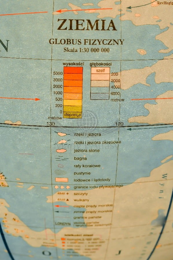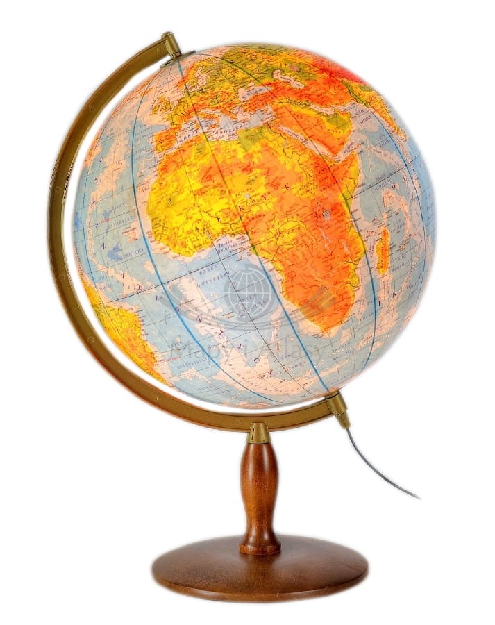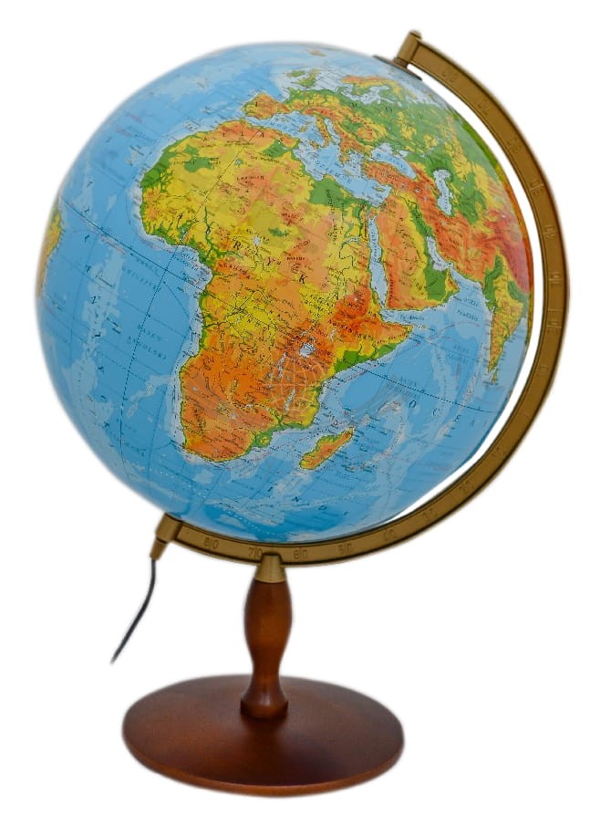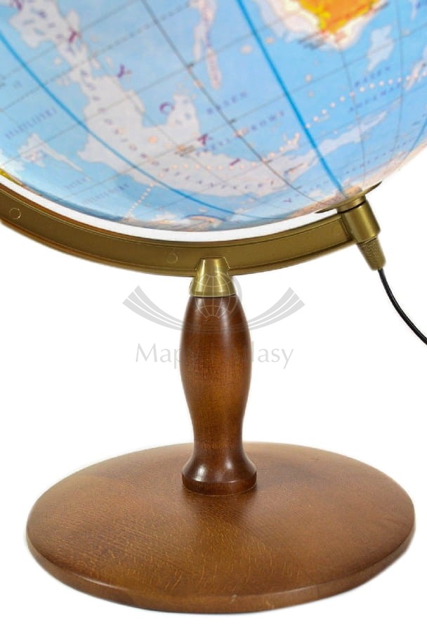 Podświetlany globus fizyczny na drewnianej podstawie i z metalowym meridianem. Duża kula o średnicy 42 centymetrów. Włączenie podświetlenia zmienia barwy globusa, ale kartografia pozostaje bez zmian.