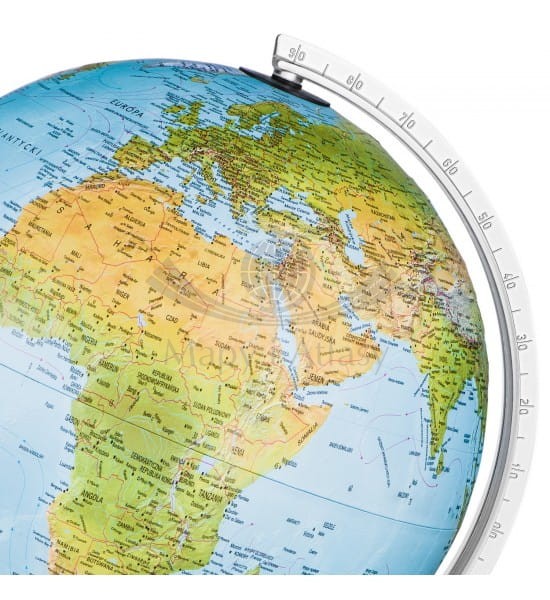 Podświetlany globus plastyczny Frost Relief montowany na plastikowej podstawie i meridianie. Mapa w języku polskim. Wielkość kuli 30 cm, wysokość 38 cm. Łatwa wymiana żarówki.