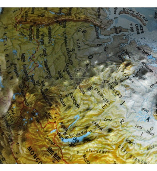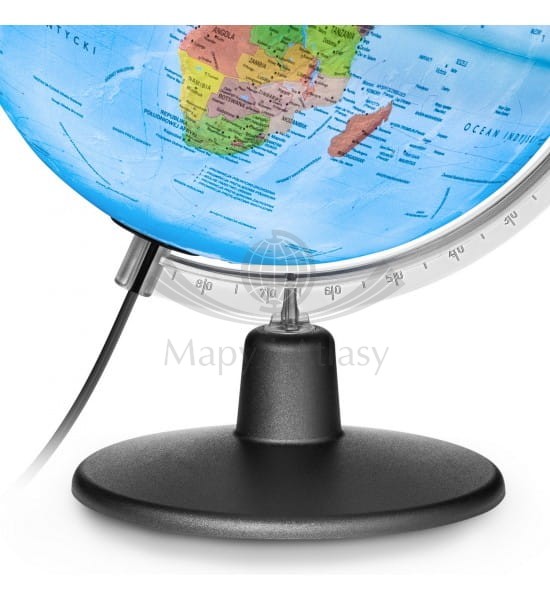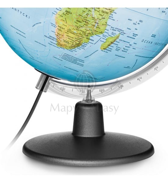 Podświetlany globus plastyczny Frost Relief montowany na plastikowej podstawie i meridianie. Mapa w języku polskim. Wielkość kuli 30 cm, wysokość 38 cm. Łatwa wymiana żarówki...