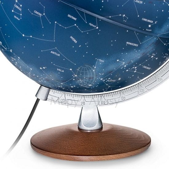 Podświetlany globus nieba Stellare Plus montowany na metalowym meridianie i drewnianej podstawie. Wielkość kuli 30 cm, wysokość 38 cm. Łatwa wymiana żarówki...