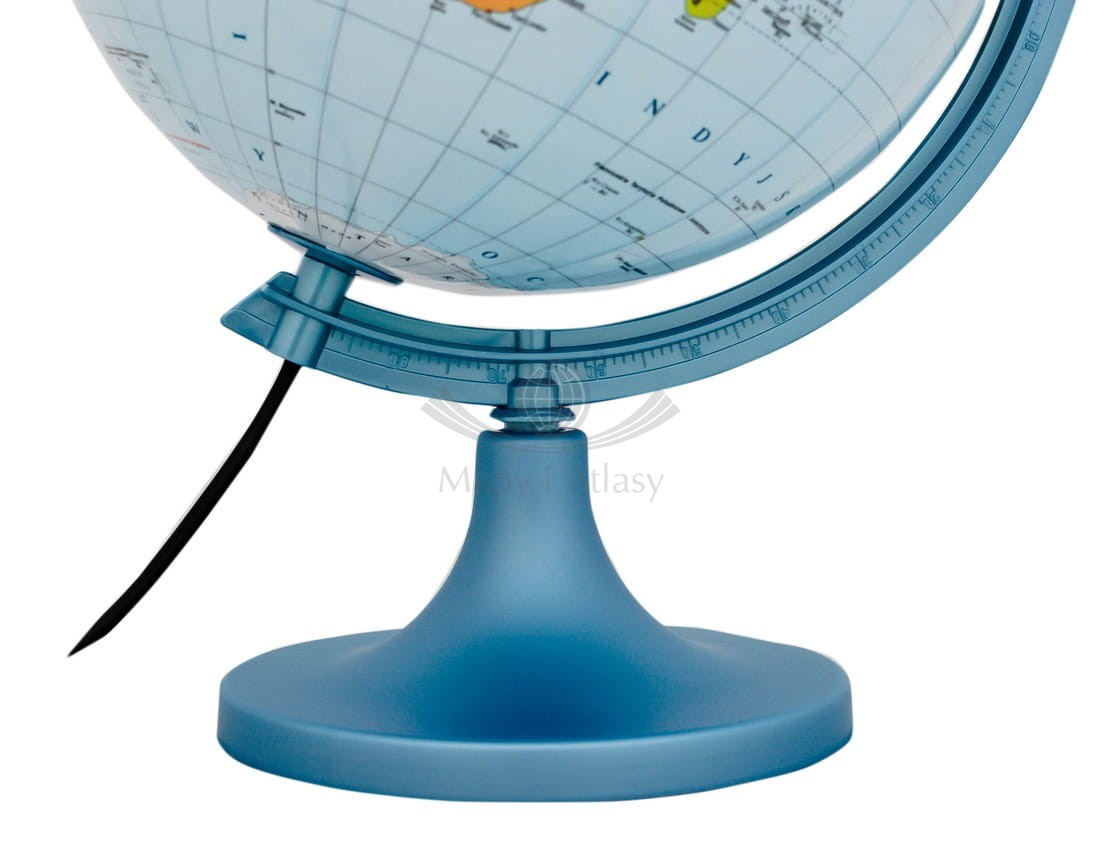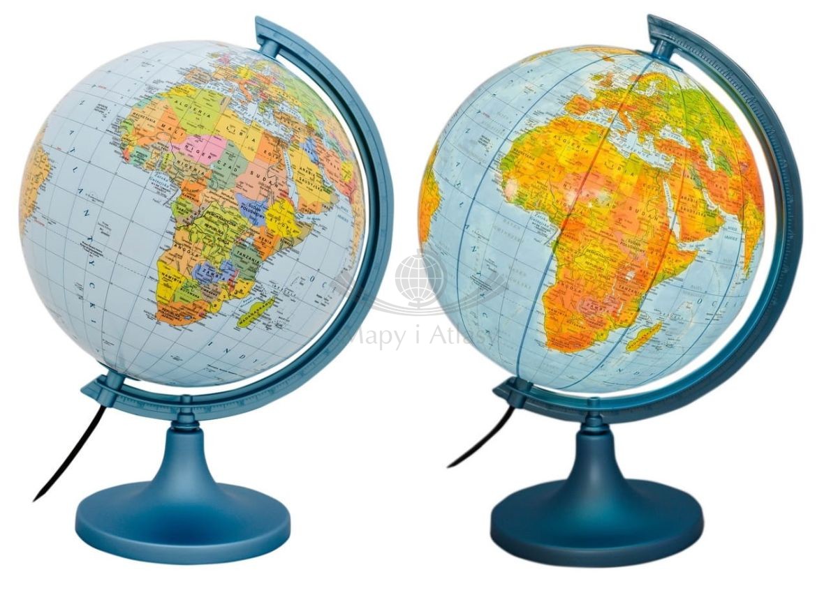 Globus zawiera mapę polityczną świata, natomiast po podświetleniu pojawia się mapa fizyczna.