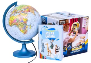 Do globusa dołączono atlas świata dla dzieci w formie kolorowanki.