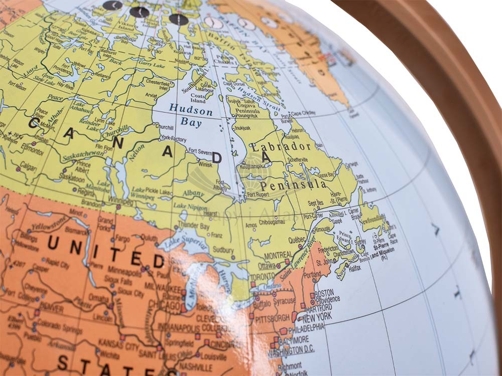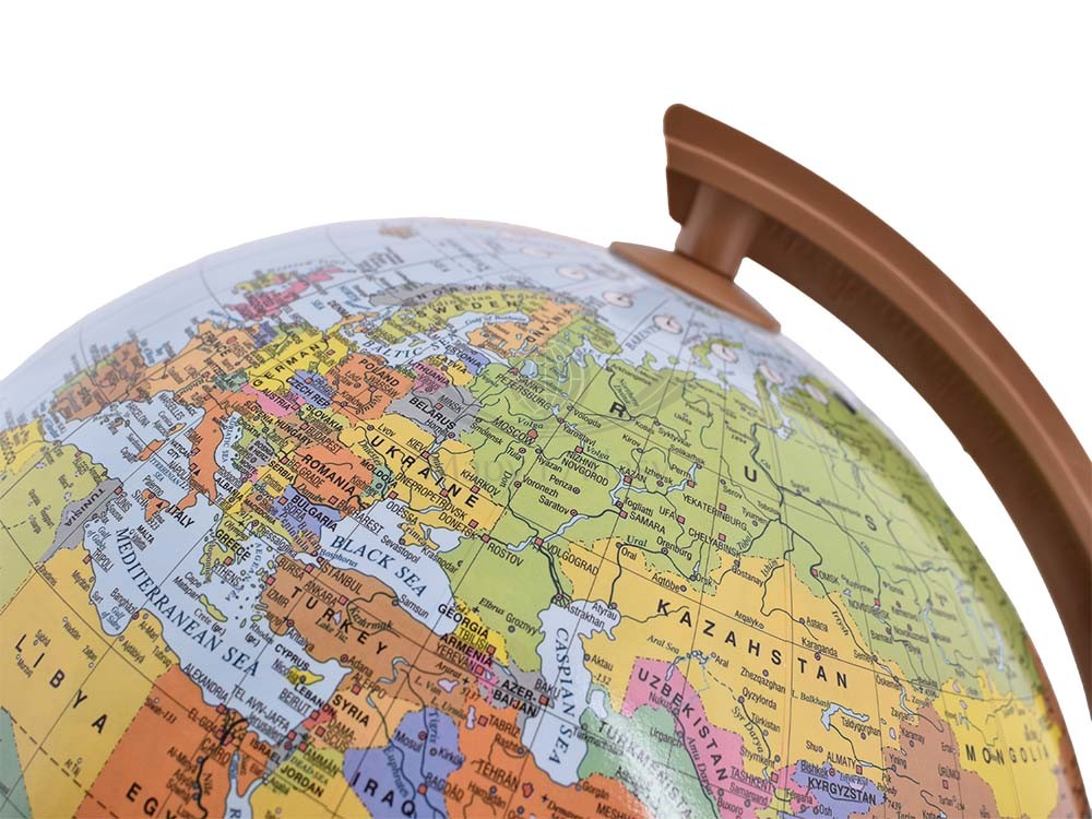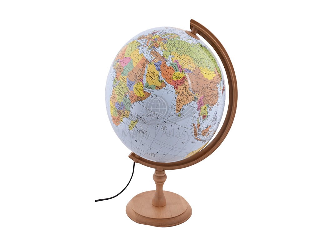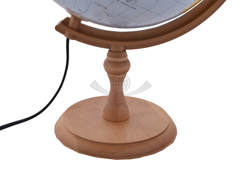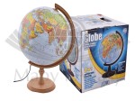Podświetlany globus polityczny o średnicy 32 cm w skali 1:40 000 000 w języku angielskim z dostępem do aplikacji. Podstawa drewniana.