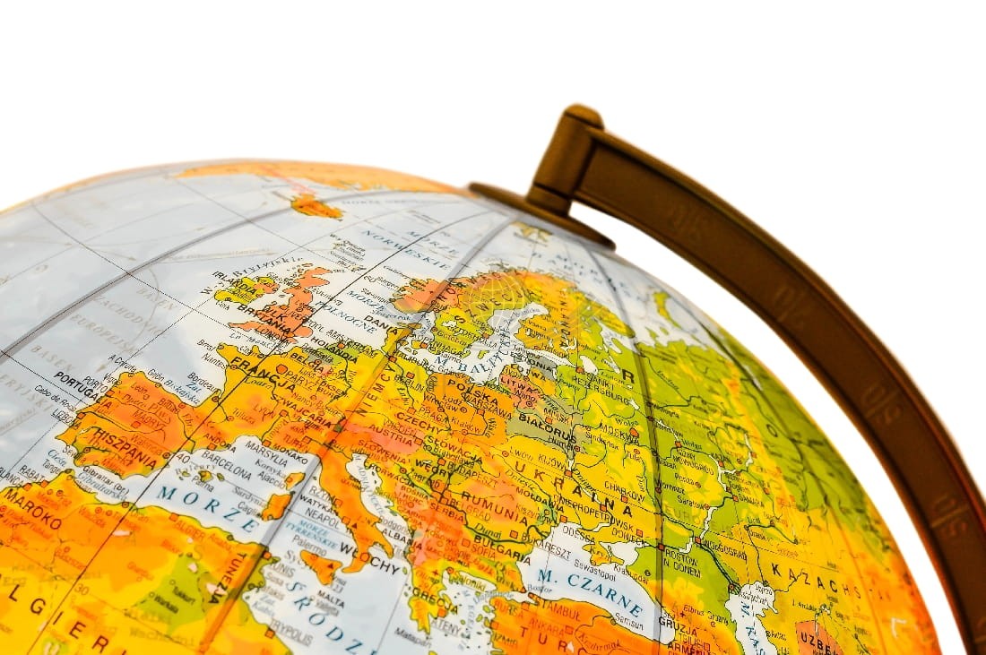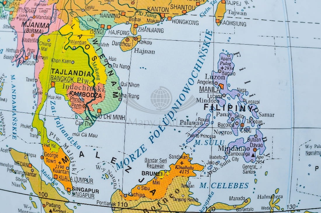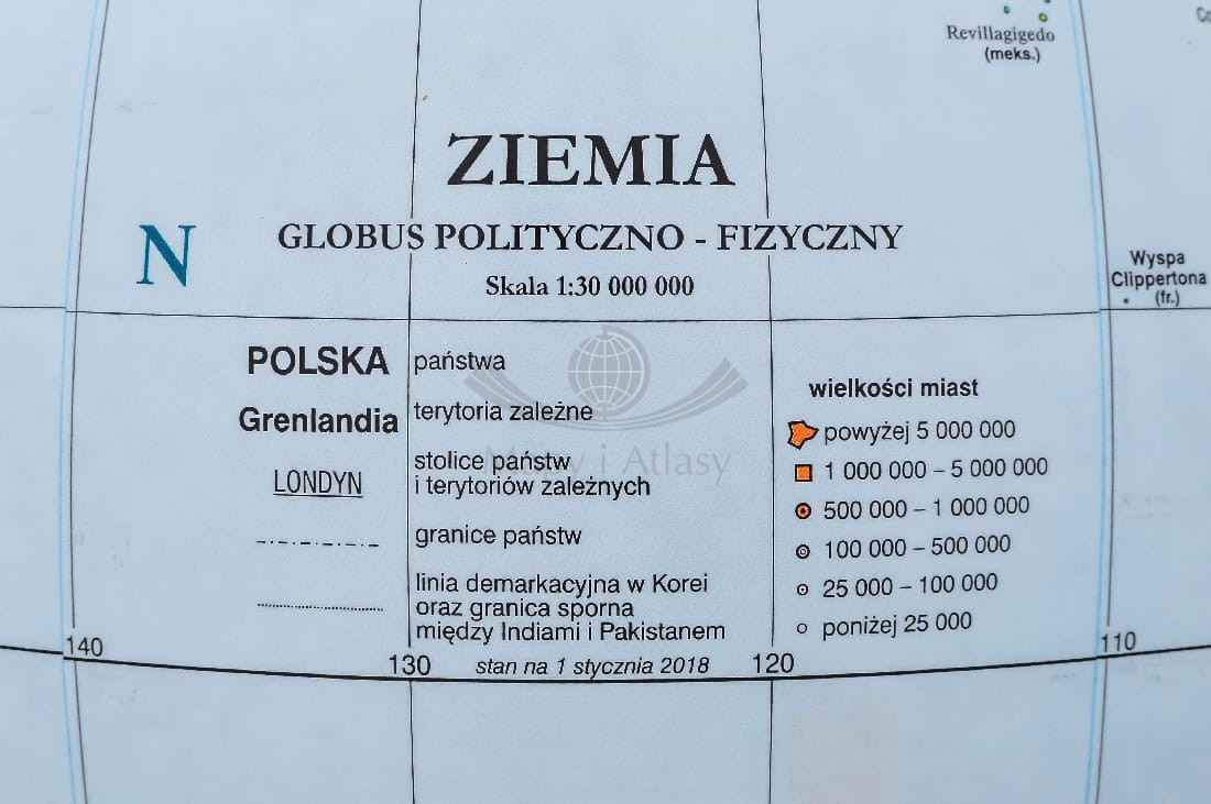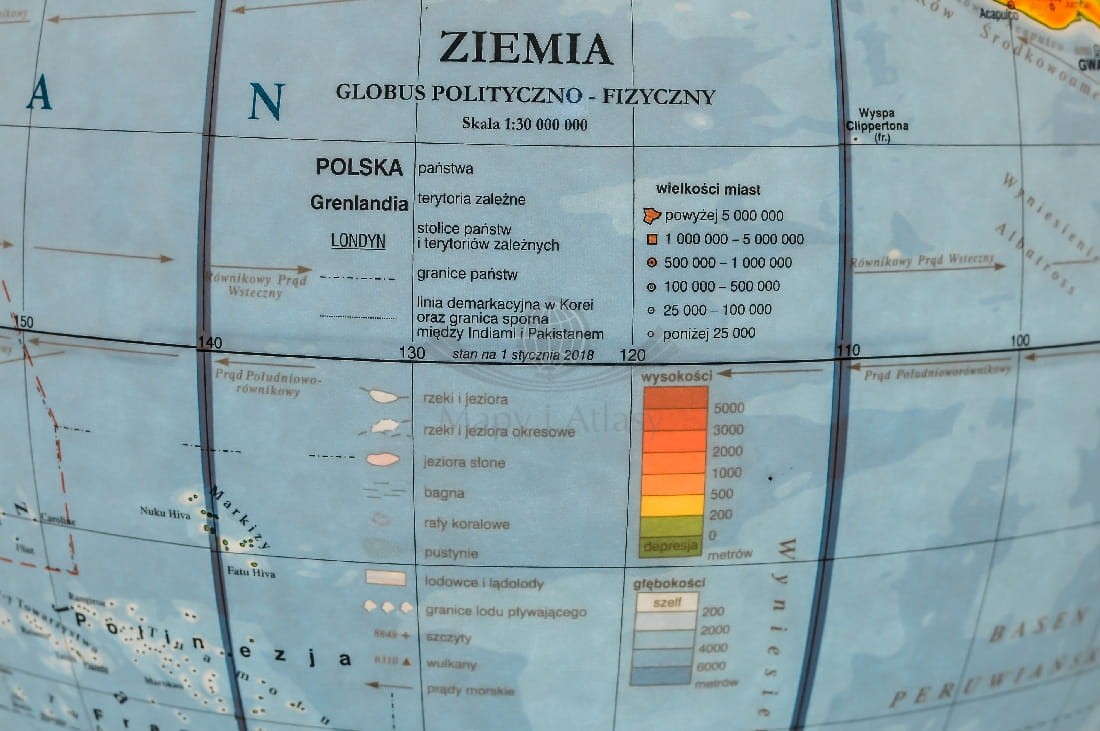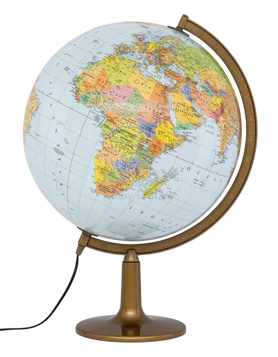 Podświetlany globus polityczno-fizyczny o średnicy 42 cm w skali 1:30 000 000 z dostępem do aplikacji. Podstawa plastikowa.