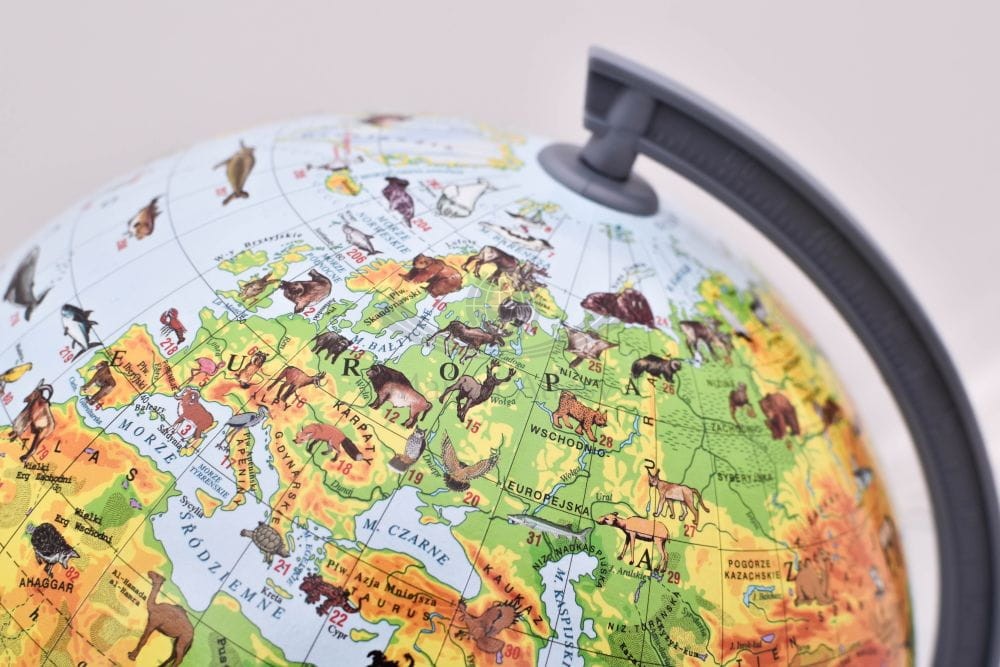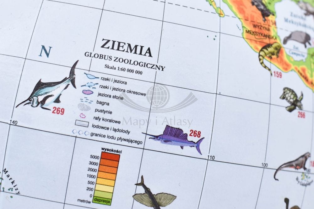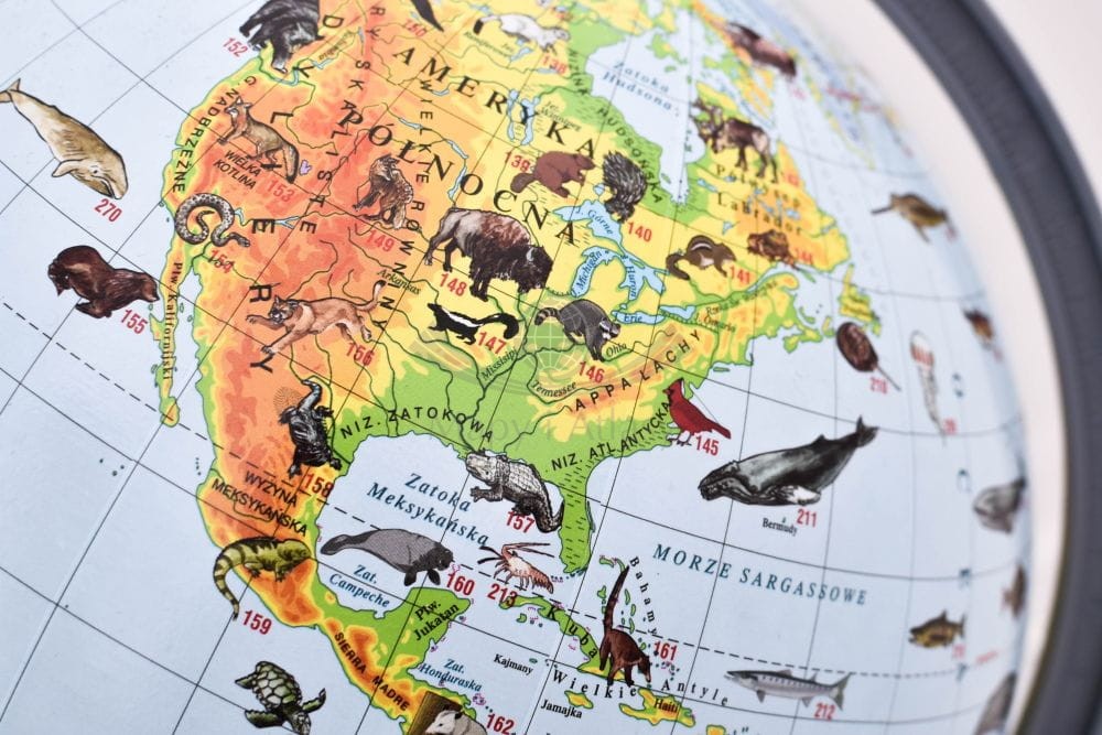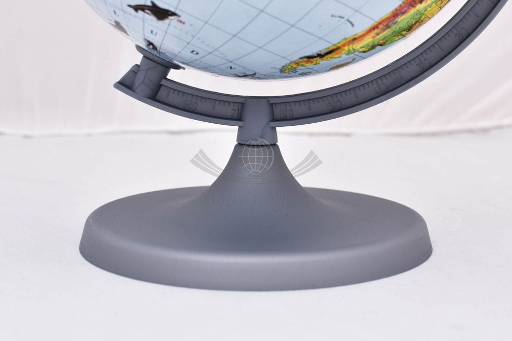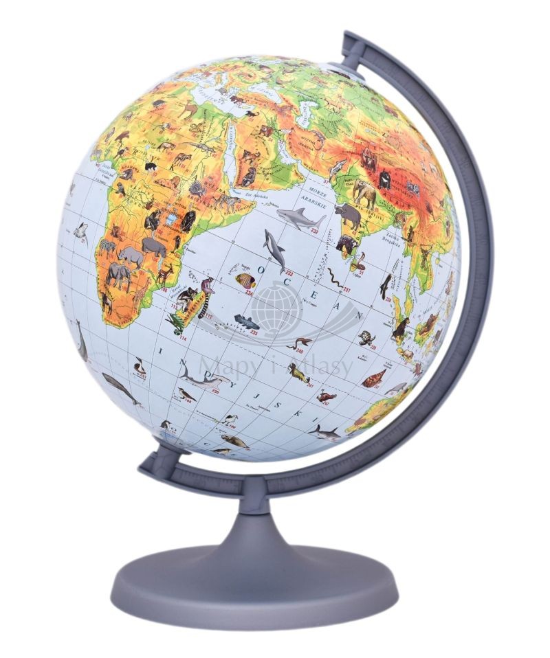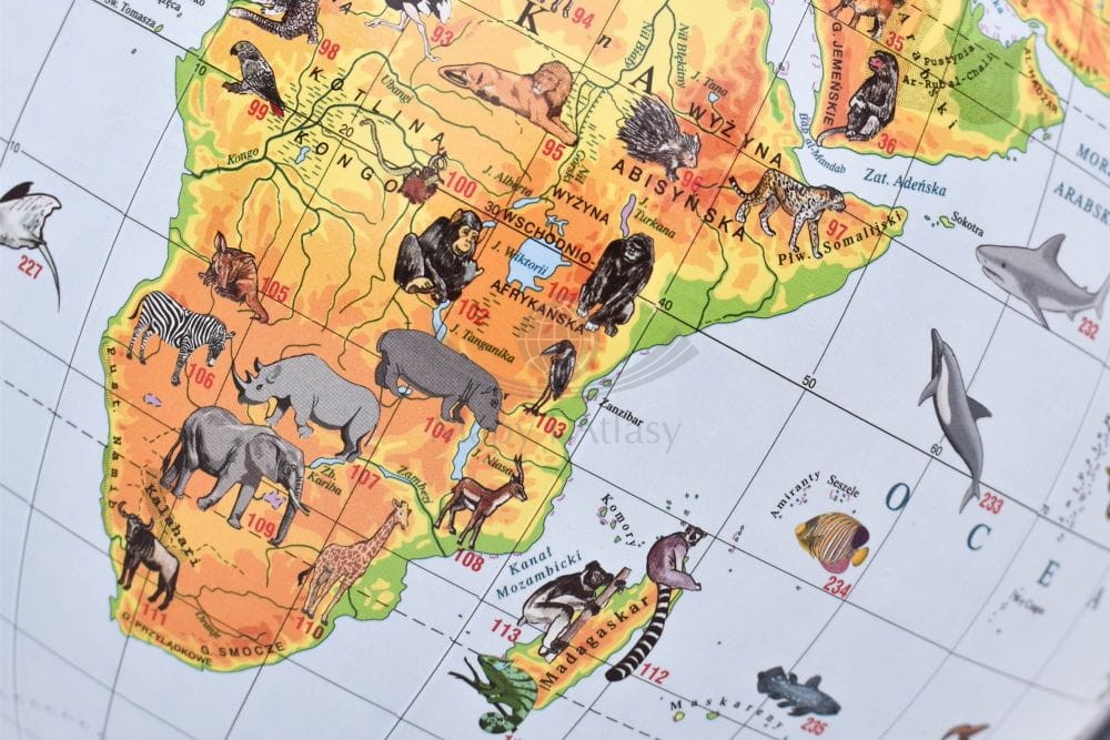 Nieduży globus szkolny przedstawiający mapę fizyczną świata w skali 1:60 000 000, na którą naniesiono ilustracje zwierząt. Mapa wskazuje miejsca występowania poszczególnych gatunków, które żyją na naszej planecie.
