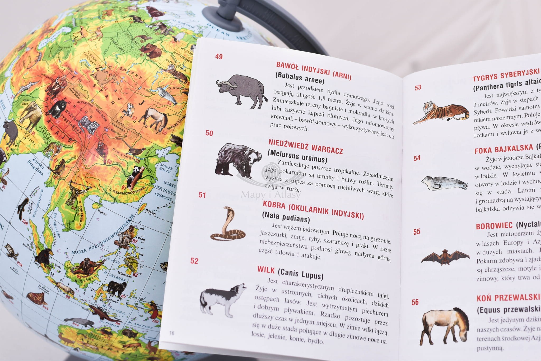 Dodatek do globusa stanowi książeczka z krótkimi opisami 275 zwierząt.