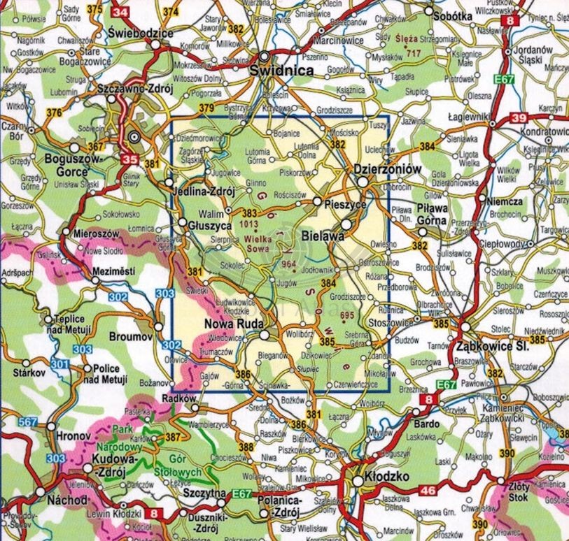 Składana, laminowana mapa turystyczna Gór Sowich. Obejmuje region Sudetów Środkowych, położony w bezpośrednim sąsiedztwie Wałbrzycha. Zasięg mapy wyznaczają: Głuszyca na zachodzie, Bystrzyca Górna na północy, Dzierżoniów i Srebrna Góra na wschodzie oraz Nowa Ruda na południu.