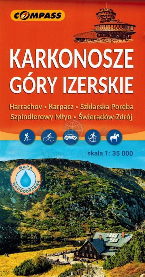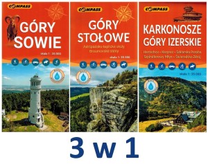 Zestaw trzech składanych, laminowanych map turystycznych w skali 1:35 000 wydawnictwa Compass: Gór Sowich, Stołowych, Izerskich i Karkonoszy.
