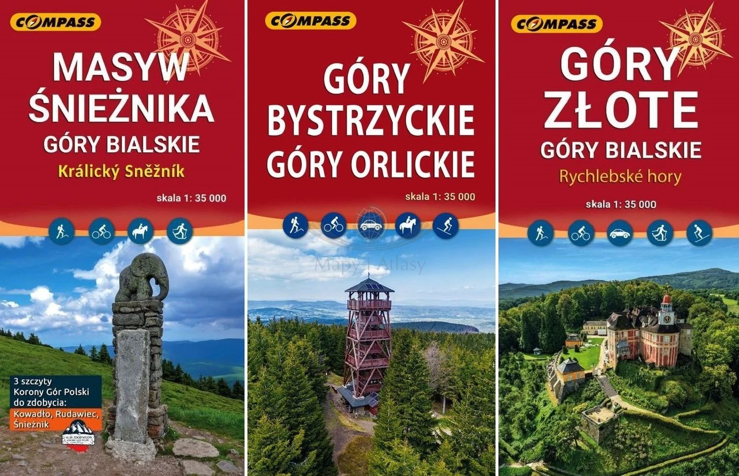 Zestaw trzech składanych map turystycznych wydawnictwa Compass w skali 1:35 000: Masyw Śnieżnika i Góry Bialskie, Góry Bystrzyckie i Orlickie, góry Złote i Rychlebske Hory.