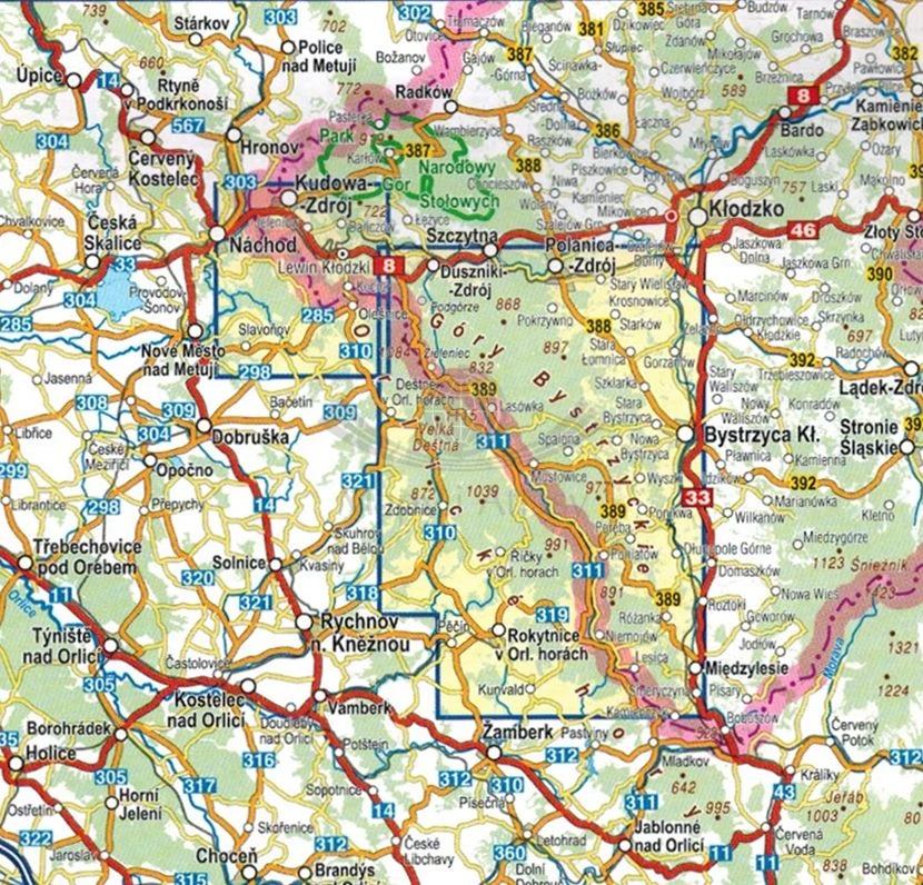 Zasięg mapy wyznaczają: Bystrzyca Kłodzka na północnym-zachodzie, Międzylesie na południowym-zachodzie oraz Jindrichov na południowym-wschodzie. Obszar mapy obejmuje: Masyw Śnieżnika z najwyższym szczytem Śnieżnikiem (1426 m n.p.m.), Góry Bialskie, Kralicky Sneznik, częściowo także Rychlebske hory i Góry Złote oraz miasto Stronie Śląskie.