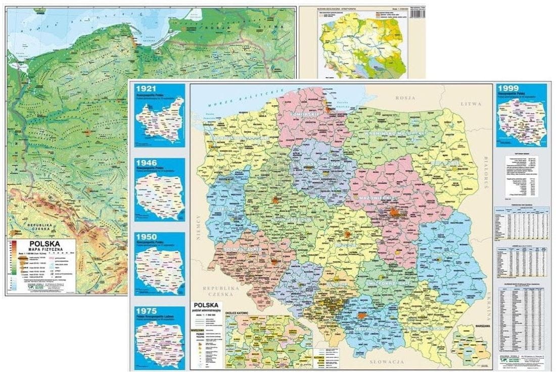 1. Dwustronna mapa podręczna Polski – fizyczna w skali 1:1 550 000 i administracyjna w skali 1:1 450 000. Wymiary: 68 x 48 cm.