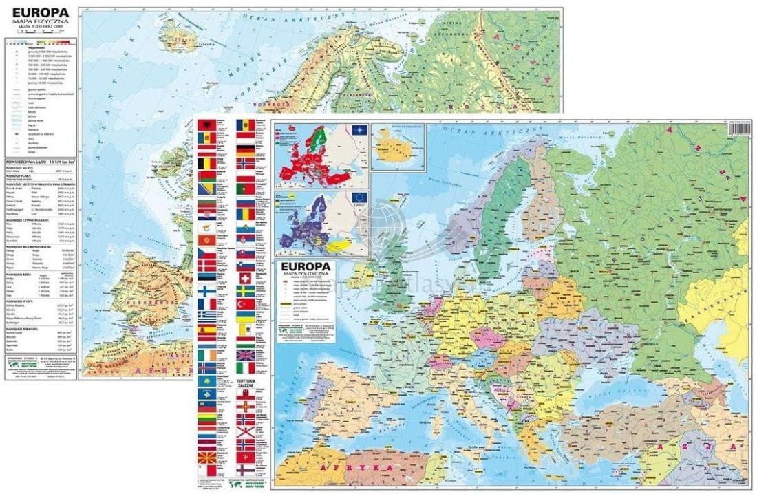 2. Dwustronna mapa podręczna Europy – fizyczna i polityczna w skali 1:10 000 000. Wymiary: 66 x 46 cm.