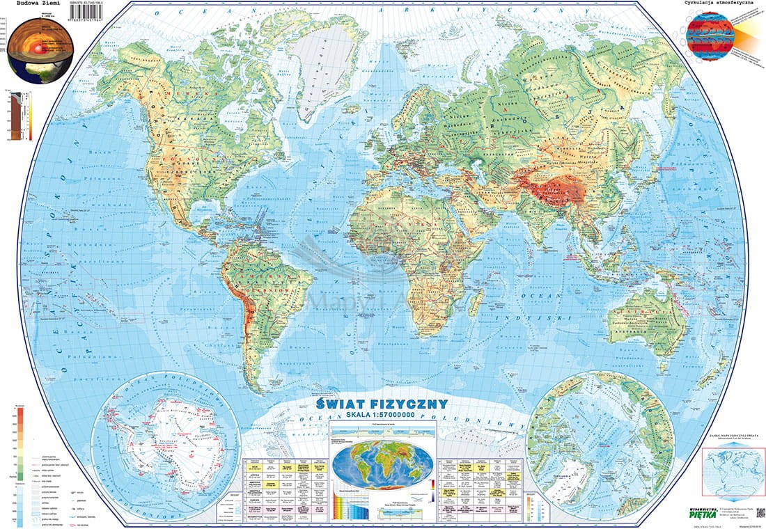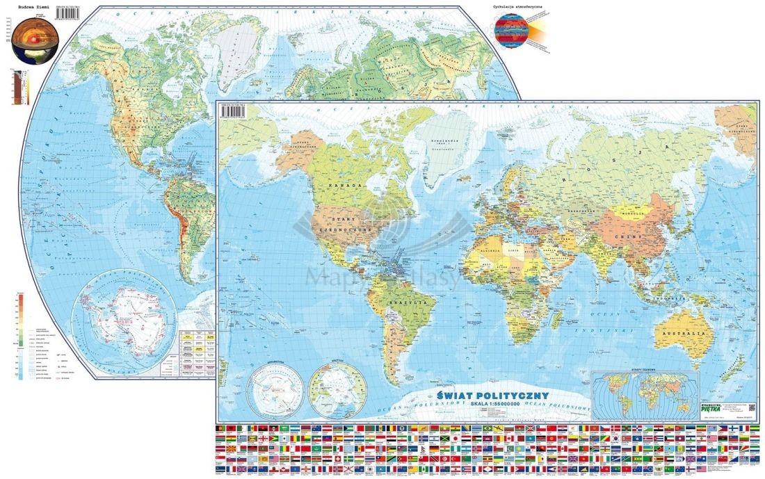 3. Dwustronna mapa podręczna świata – fizyczna w skali 1:57 000 000 i polityczna w skali 1:55 000 000. Wymiary: 69 x 49 cm.