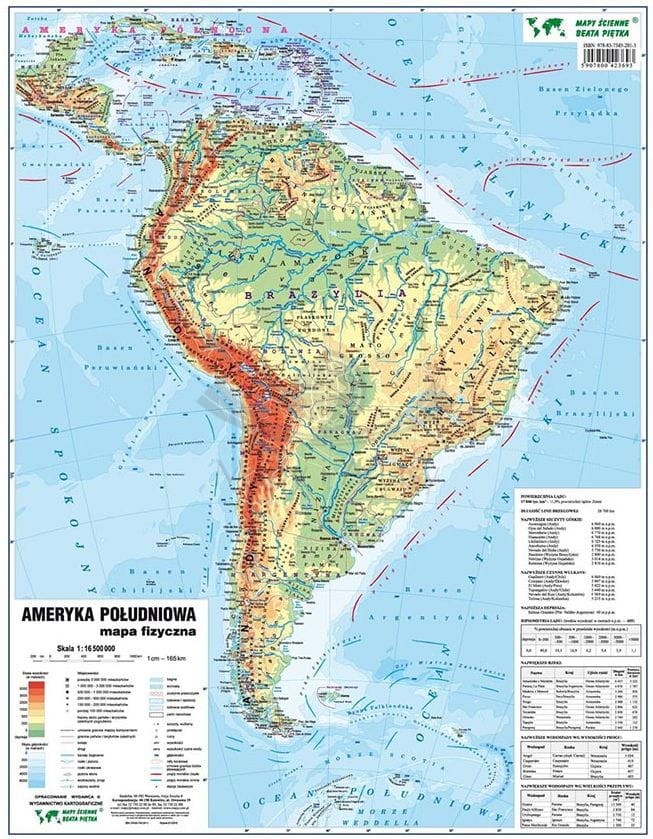 5. Dwustronna mapa podręczna Ameryki Południowej – fizyczna i polityczna w skali 1:16 500 000. Wymiary: 48 x 62,5 cm.