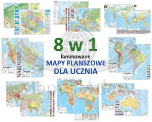 Zestaw ośmiu dwustronnych, laminowanych map podręcznych: Polski, Europy, świata, Ameryki Północnej, Ameryki Południowej, Azji, Afryki i Australii.