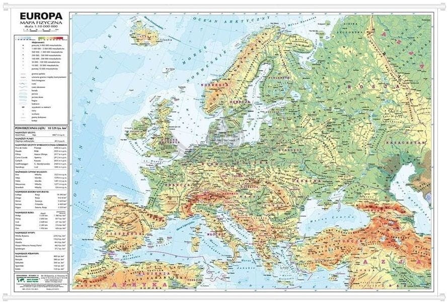 2. Dwustronna mapa ścienna Europy – fizyczna i polityczna w skali 1:10 000 000. Wymiary: 76 x 46 cm.