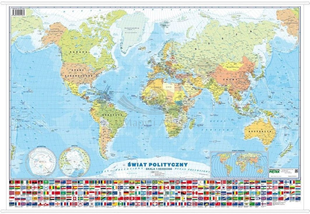Mapa zawiera dodatkowo informacje geograficzne, flagi i stolice państw, mapę stref czasowych oraz mapy biegunów.