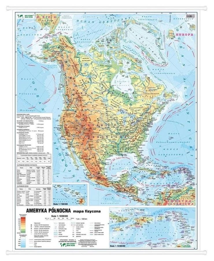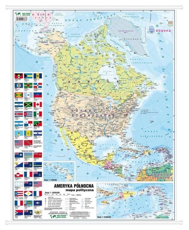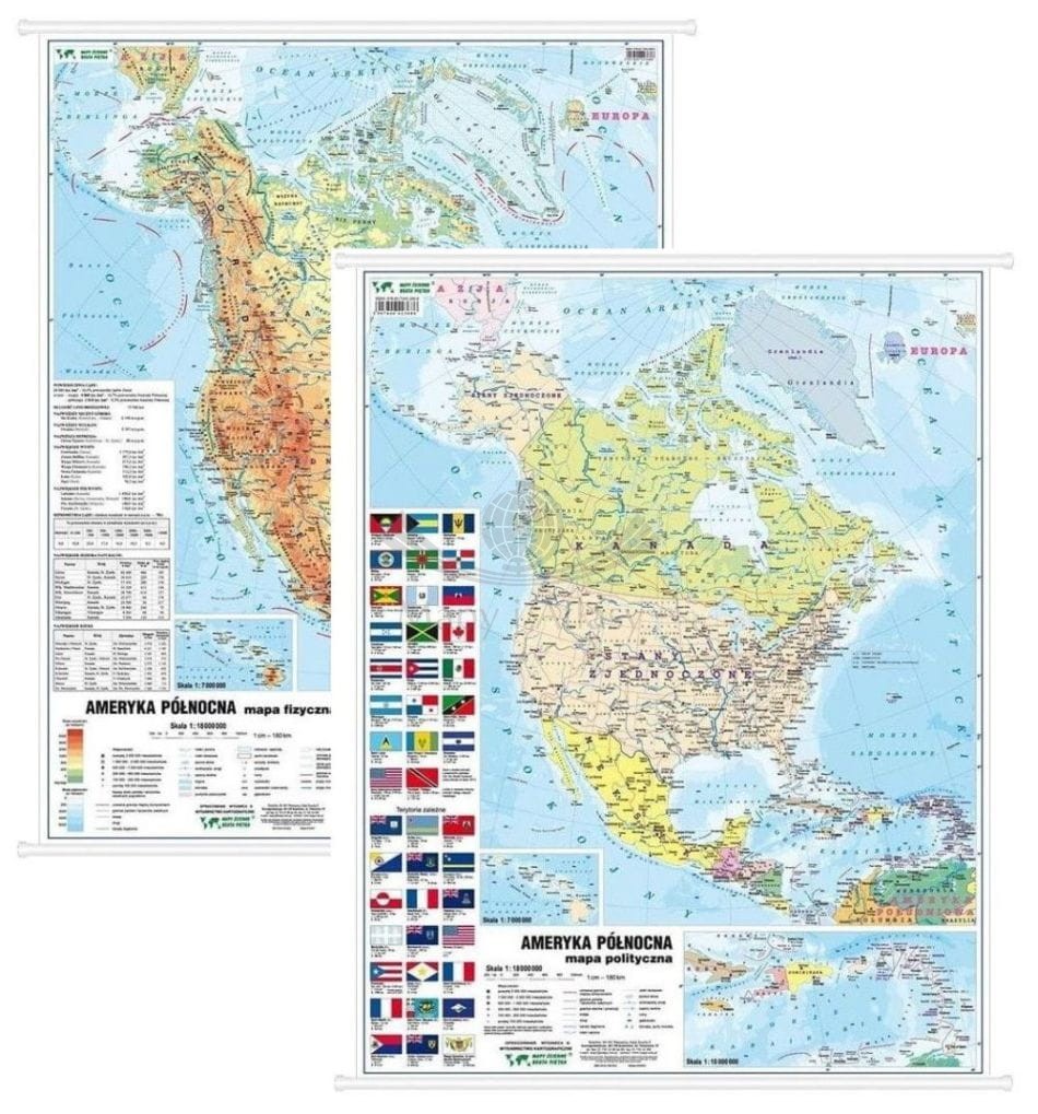 4. Dwustronna mapa ścienna Ameryki Północnej – fizyczna i polityczna w skali 1:18 000 000. Wymiary: 55 x 64 cm.