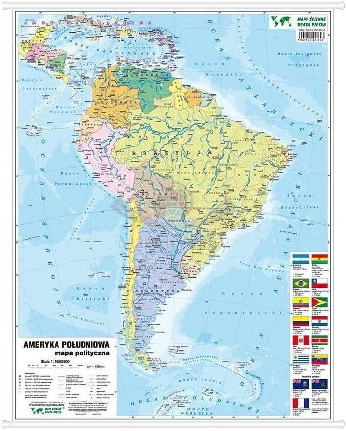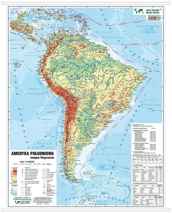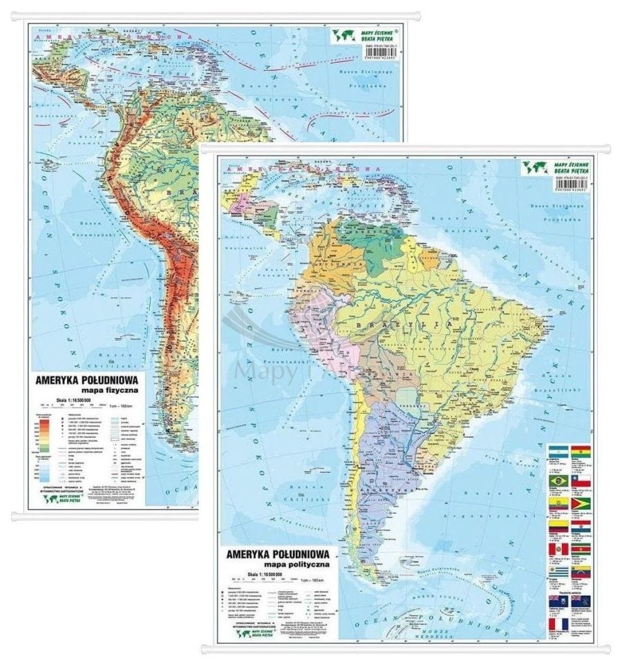 5. Dwustronna mapa ścienna Ameryki Południowej – fizyczna i polityczna w skali 1:16 500 000. Wymiary: 55 x 63 cm.