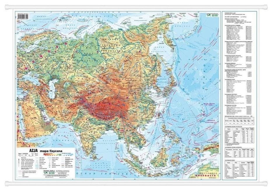 6. Dwustronna mapa ścienna Azji – fizyczna i polityczna w skali 1:22 000 000. Wymiary: 76 x 55 cm.