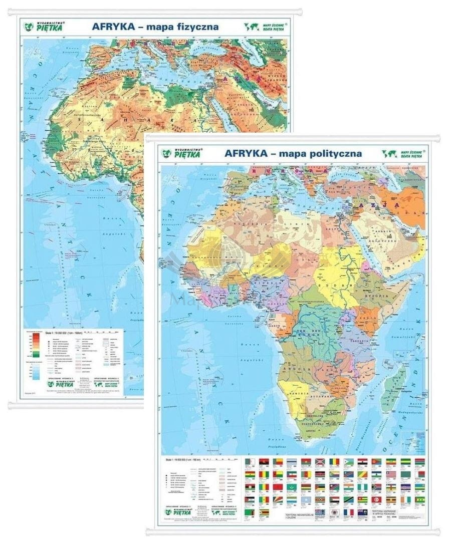 7. Dwustronna mapa ścienna Afryki – fizyczna i polityczna w skali 1:19 000 000. Wymiary: 55 x 68 cm.