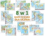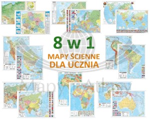 Zestaw ośmiu dwustronnych map ściennych: Polski, Europy, świata, Ameryki Północnej, Ameryki Południowej, Azji, Afryki i Australii.